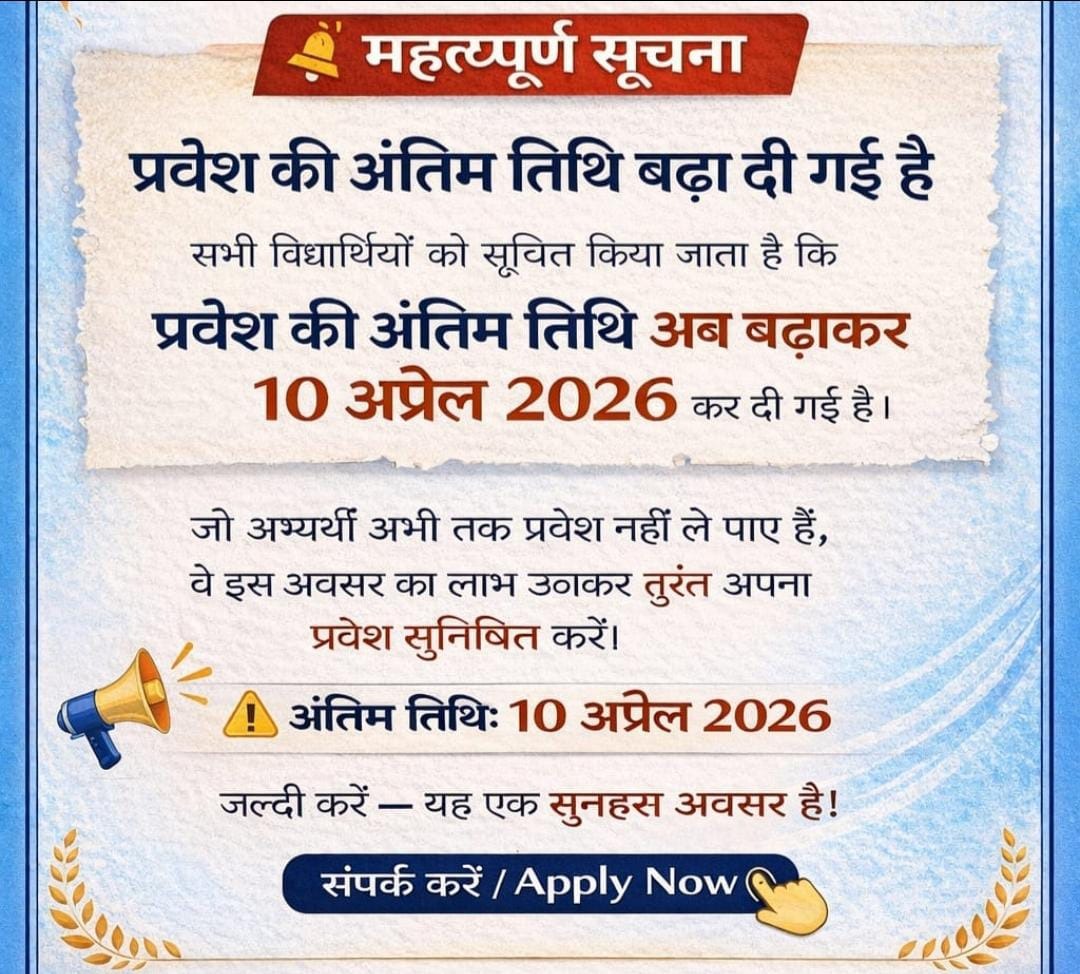 🚀 यह एक महत्वपूर्ण अवसर है — जो अभ्यर्थी अभी तक प्रवेश नहीं ले पाए हैं, वे निर्धारित समय सीमा के भीतर शीघ्र आवेदन करें।